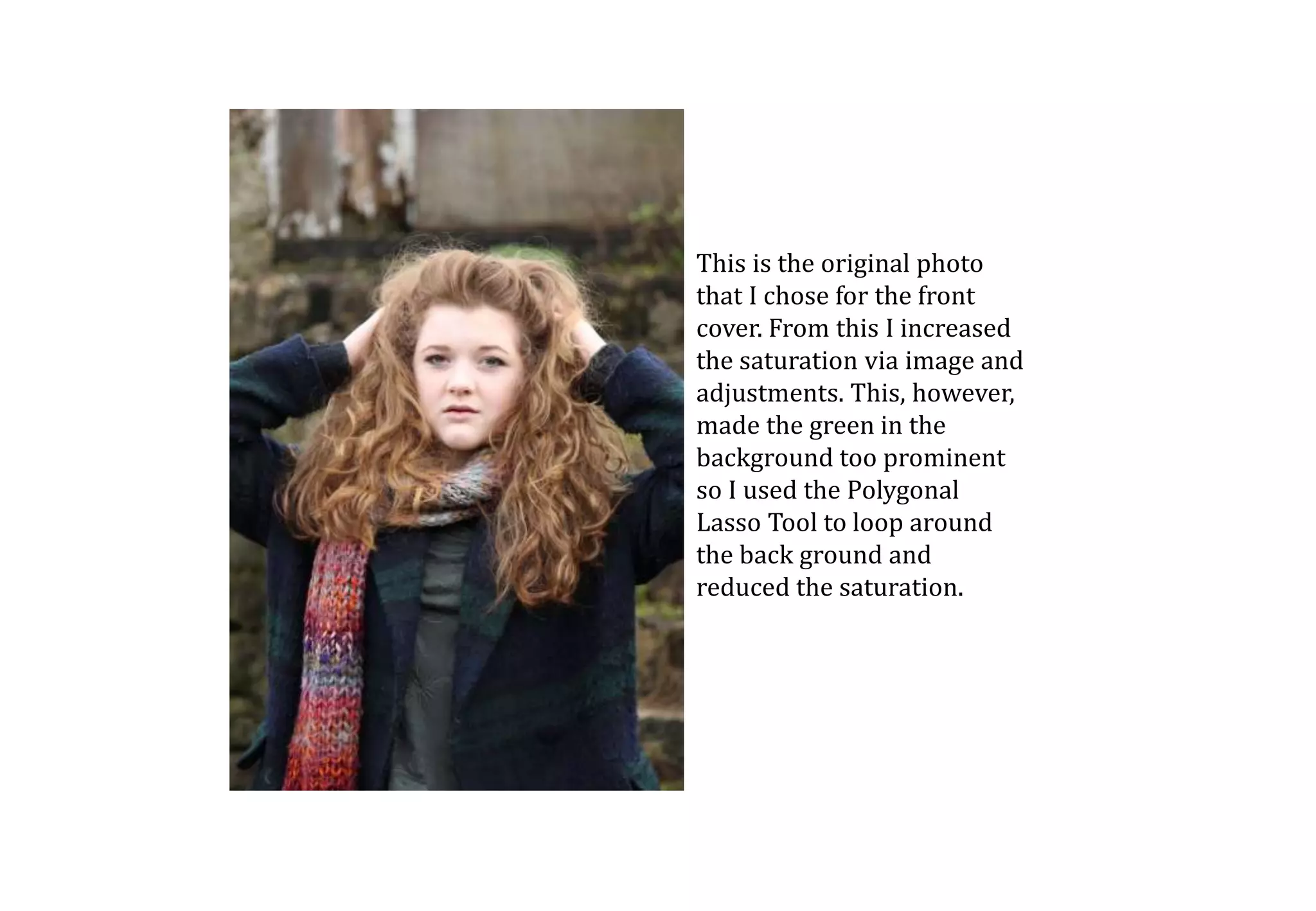 This document describes the various photo editing processes used to prepare a photo for use as a magazine front cover in Photoshop. It details how the author adjusted saturation, used tools like the polygonal lasso and smudge tool to edit aspects of the background and subject's appearance. Issues with eyeliner were addressed using the clone stamp and brush tools. Additional effects like added shadows around the eyes, exaggerated hair curls, and adjustments to contrast, sharpness and cropping were made. Text elements and a color scheme were added to complete the mock-up front cover design.
