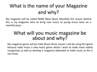 1) The magazine will be called NMM and aims to introduce new music to young music lovers each month with a focus on the indie genre.