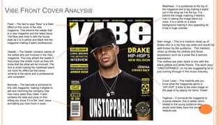 The Vibe analysis notes key elements like the masthead, flash, header, main image of Drake, cover lines about hip hop, and taglines connecting to social media.