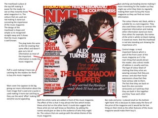 The document summarizes the design elements of a music magazine cover. Key features include a red masthead in the top left to identify the magazine brand. Eye-catching subheadings and artist images aim to attract readers and drive music purchases. Color themes of red, black, and white are used to make important information like the masthead and artist names stand out against the design. A central image of the band Green Day serves as the main attraction to grab readers' attention and communicate the cover story. Additional design elements like puffs and prize promotions are used to further incentivize readers to buy the magazine.