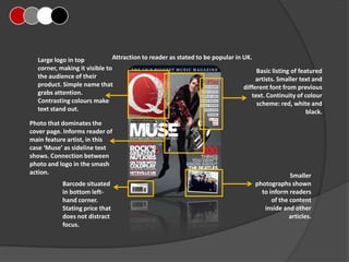 This document summarizes the key elements found on music magazine covers. It notes that covers typically feature a large, central image highlighting the main artist or article inside. They also include the magazine logo, artist listings, barcodes, and advertisements for any free merchandise included. The font sizes, colors, and placements of these elements are designed to attract readers' attention and communicate the main focus of the issue without distraction.