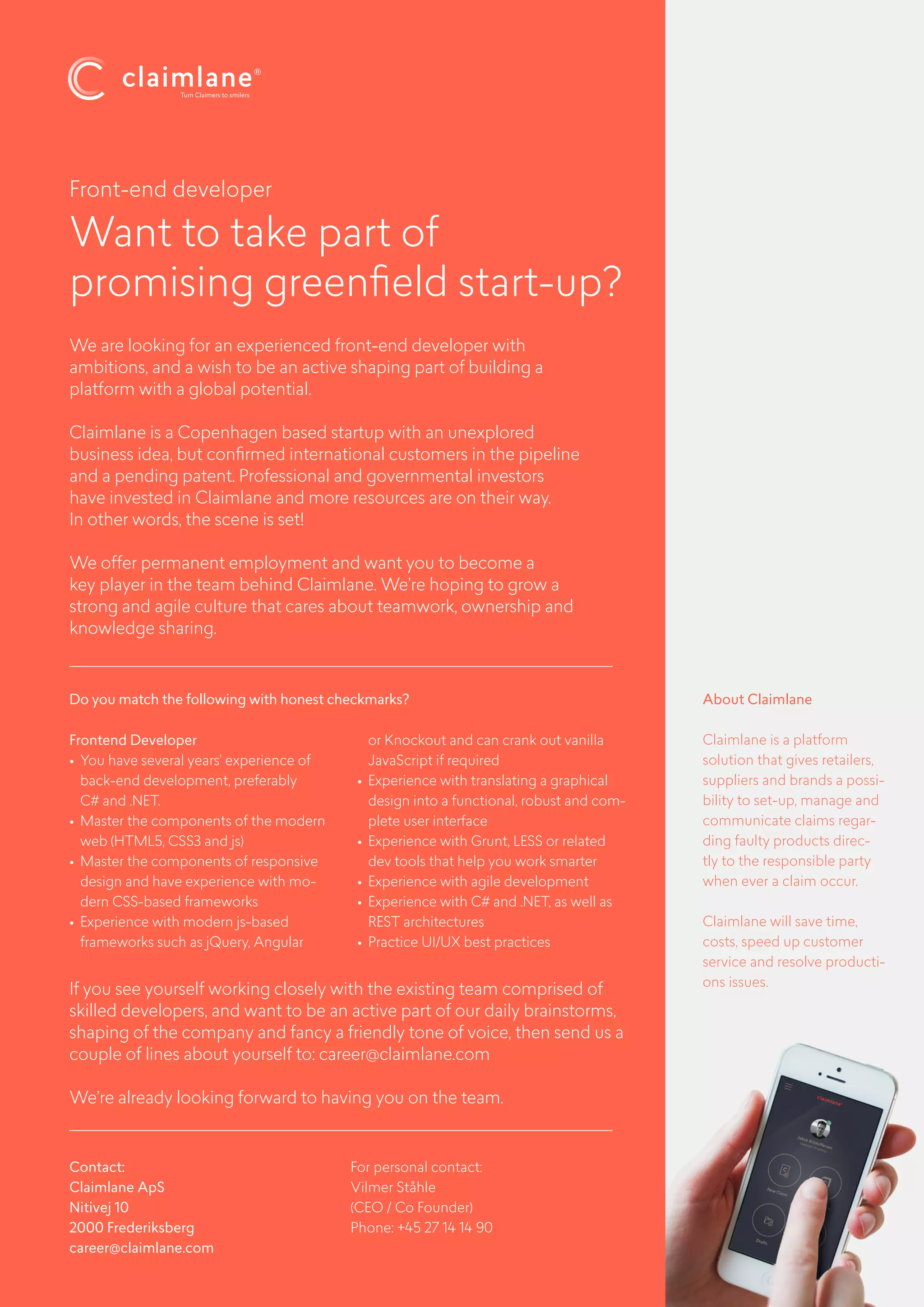 Claimlane is a Copenhagen-based startup offering a platform for retailers and suppliers to manage product claims efficiently. They are seeking an experienced front-end developer with a strong background in web technologies and a collaborative spirit to join their team. The company has confirmed international customers and is backed by professional investors, aiming to foster a culture of teamwork and knowledge sharing.