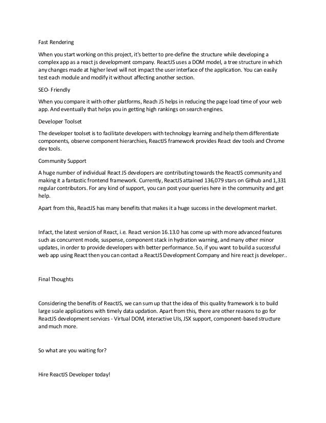 ReactJS is a popular JavaScript library for building user interfaces that allows developers to create reusable UI components. It has gained widespread popularity due to its simplicity, consistency and ability to quickly render complex UIs. Some of the key benefits of using React include its ease of use, support for custom components, fast rendering and SEO-friendly design. It also has a large developer community contributing tools and support. Overall, ReactJS is well-suited for developing large-scale web applications with timely data updates and rich interactive user interfaces.