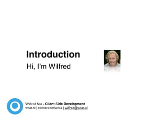 The document outlines an introductory workshop on client side development given by Wilfred Nas. It covers HTML, CSS, and JavaScript. For HTML, Wilfred discusses proper document structure using appropriate tags like div, table, and headings. For CSS, he covers selectors, positioning, and working around browser inconsistencies. For JavaScript, he emphasizes progressive enhancement and avoiding reliance on it for accessibility.