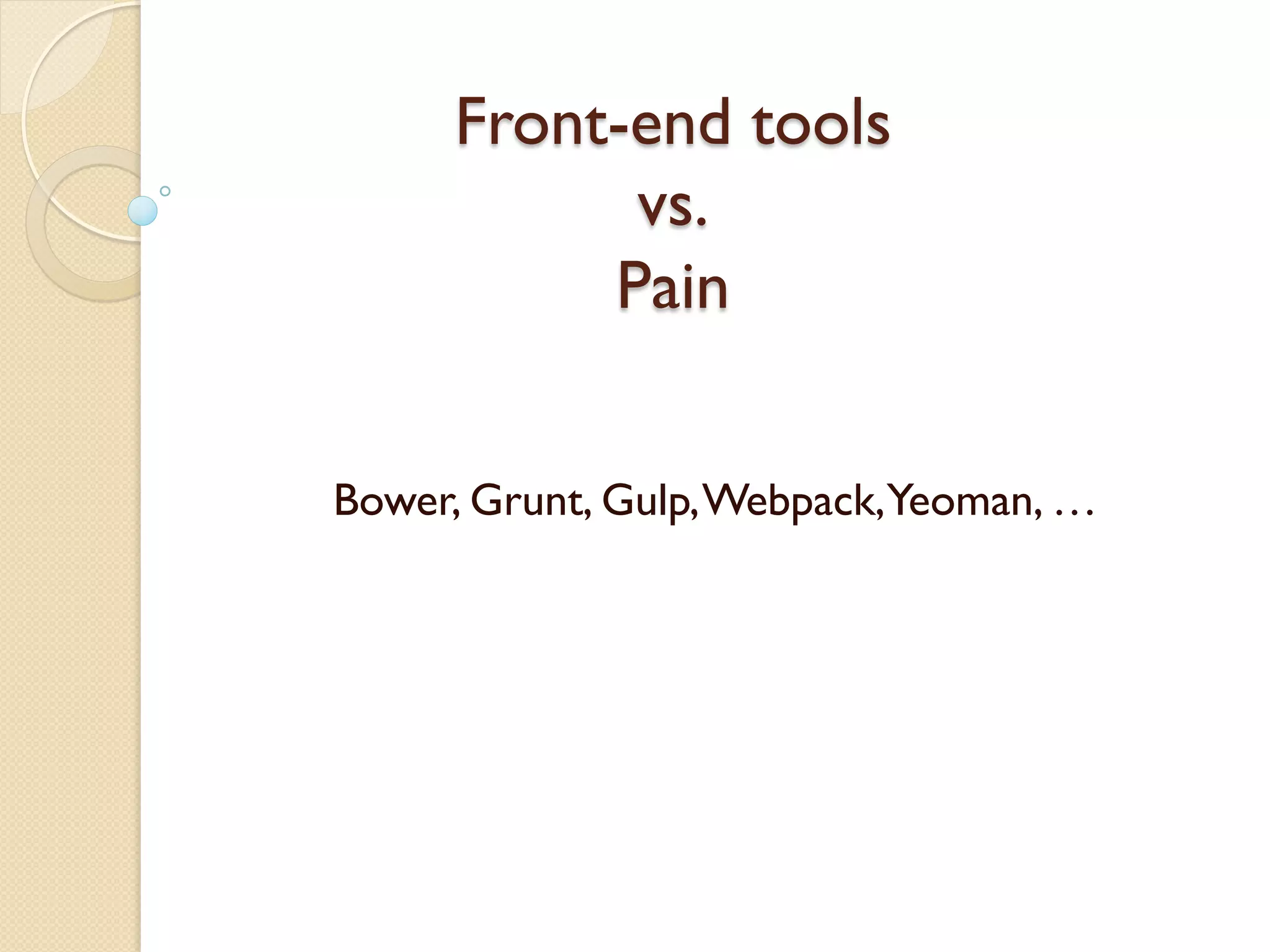 The document discusses various front-end development tools including Bower, Grunt, Gulp, Webpack, Yeoman, and PhantomJS. It provides information on what each tool is used for, such as package management, task automation, bundling code, and testing. Examples are given of how to configure and use the tools in a front-end workflow.