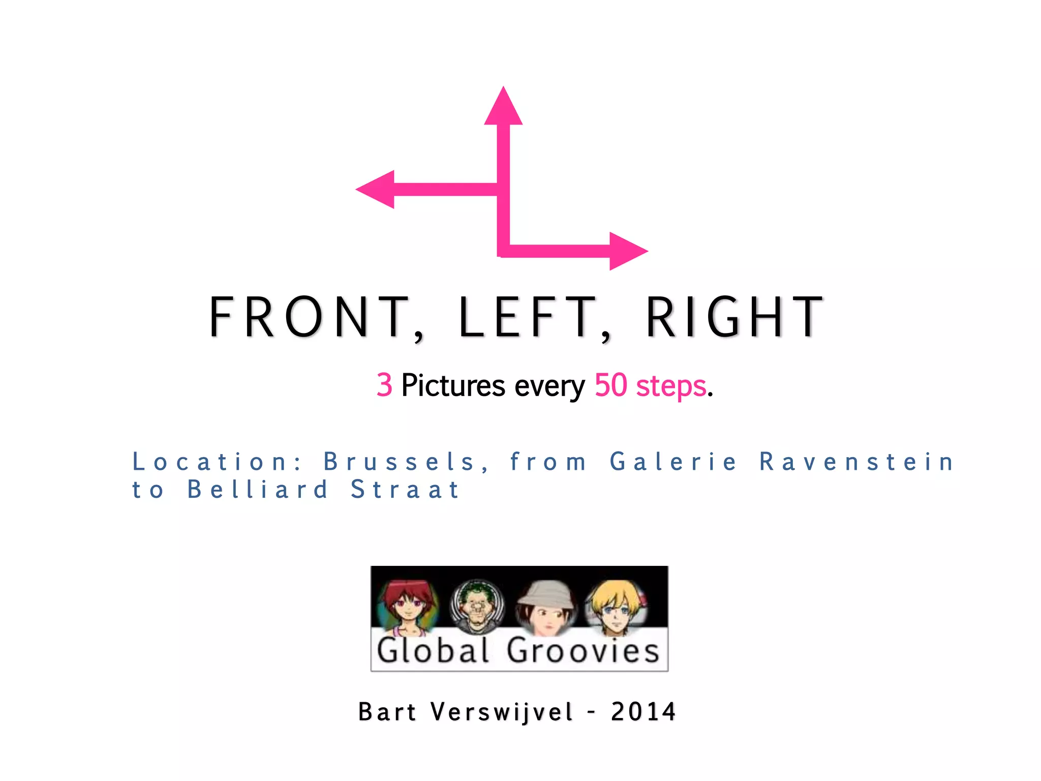 This document provides instructions for taking pictures along a route in Brussels from Galerie Ravenstein to Belliard Straat, instructing the photographer to take 3 pictures every 50 steps while recording the direction each picture is taken. The photos are part of an artwork created in 2014 by Bart Verswijvel.