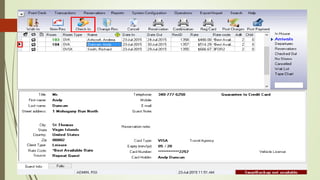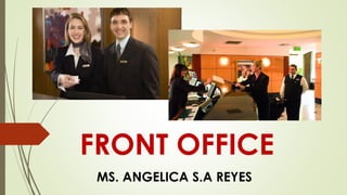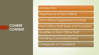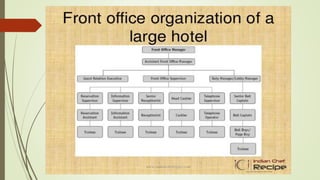 The document outlines the essential functions and organizational structure of front office operations in a hotel, detailing staff roles, professional etiquette, and customer interaction strategies. It emphasizes the importance of guest relations, handling complaints, and efficient file organization alongside current trends in the hospitality industry. Additionally, it provides practical examples of communication with guests during check-in and check-out processes, alongside tips for managing customer concerns and improving service quality.