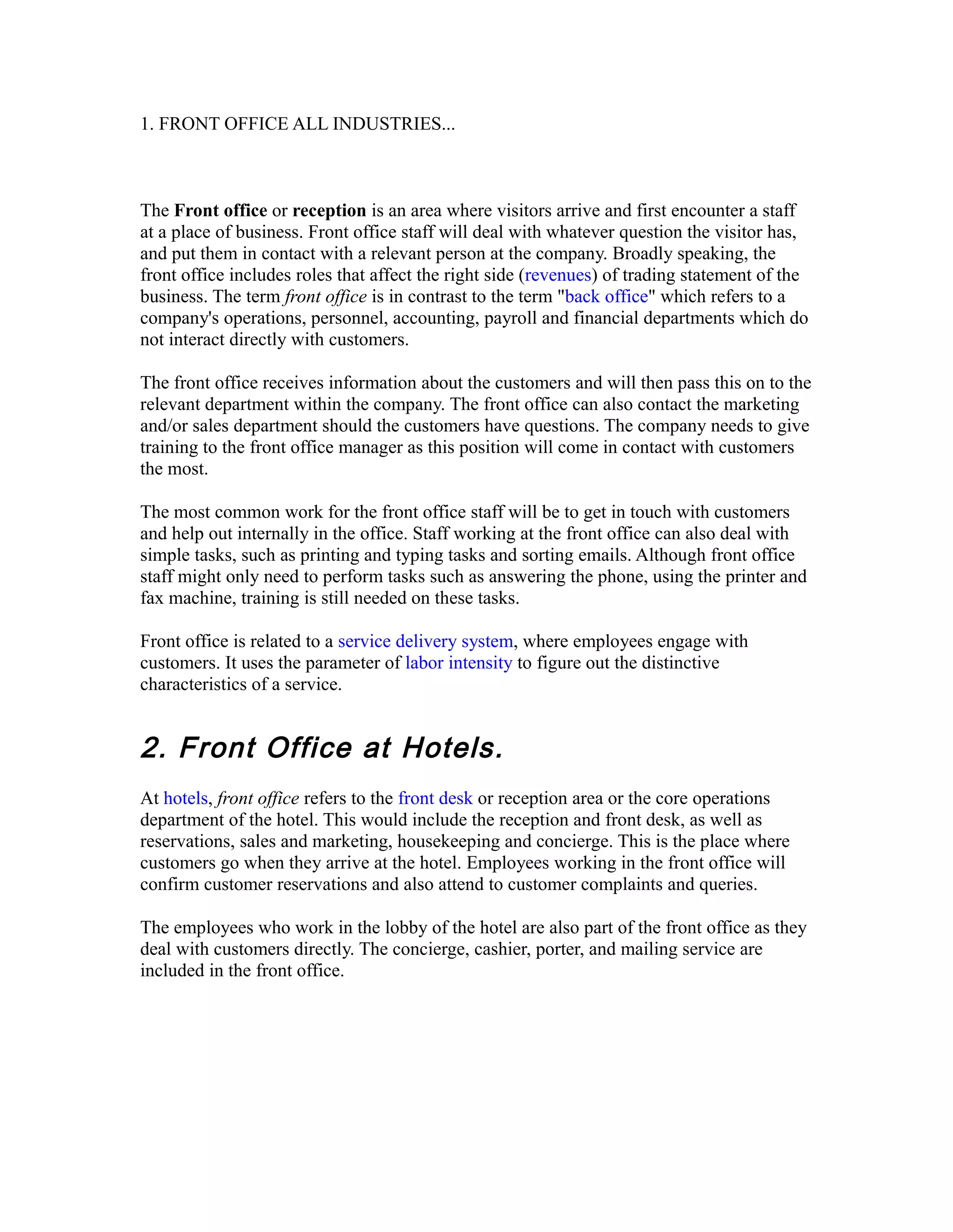 The front office refers to the area where visitors first encounter staff at a business and have their questions answered. It includes roles that directly interact with and serve customers. Front office staff receive customer information and pass it to relevant departments, and can contact marketing or sales if needed. Common front office tasks include answering phones, printing, sorting emails, and helping customers. Training is required even for basic tasks due to the customer service role. At hotels specifically, the front office includes the front desk, reservations, sales, marketing, housekeeping, and concierge - the areas where customers interact upon arrival. Employees in these roles confirm reservations, handle complaints and queries, and provide customer service in the lobby as well.