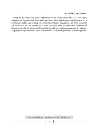 This document provides an overview of managing front office operations at five-star hotels, with a focus on manpower management. It discusses the various challenges of operating a hotel front office, including responsibilities of front office staff like receptionists, concierges, telephone operators, and bell boys. It also outlines the classification of hotels from economy to exceptional five-star hotels and the types of services expected at each level.