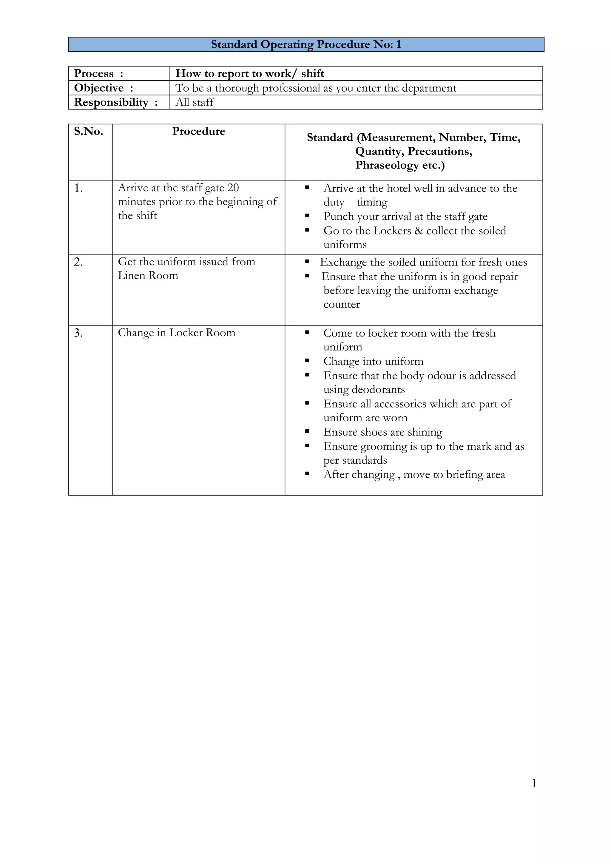 2. Procedures include arriving 20 minutes before shifts, exchanging uniforms, attending briefings, completing opening/closing duties, welcoming all guests with warmth and assistance, and giving priority recognition to repeat guests.