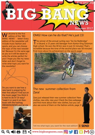 Eduard, a 15-year-old teenager, won the annual cycling race "GoGoRedbridge" in an incredible 32 minutes, beating the second place finisher's time of 58 minutes. The newsletter's first issue covers music, fashion, and sports, and encourages readers to suggest topics for future issues since the author is also a teenager. Readers can learn more about Eduard's achievement on the sports page or see previews of Zara's new summer clothing collection in the fashion article on page 3.