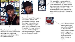 This document analyzes the imagery, styles, and tones used in magazines promoting genres like grime, rap, and R&B. The subheading calls out other artists aggressively. The main image carries stereotypes of these genres being alarming. Dark backgrounds and monochrome color schemes, along with threatening facial expressions and tattoos, create an intimidating atmosphere that symbolizes the dangers of the music and artists. Aggressive language and styles reinforce the threatening tone aimed at audiences from teens to adults.