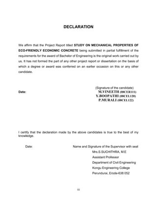 This document provides a bonafide certificate for a project report on the study of mechanical properties of eco-friendly economic concrete. It certifies that the project was conducted by three students, M.Vineeth, Y.Boopathi, and P.Murali, in partial fulfillment of their Bachelor of Engineering degree from Kongu Engineering College. The project investigated replacing natural aggregates with steel slag aggregates and M-sand to produce more sustainable concrete. Tests were conducted to determine the compressive strength, split tensile strength, modulus of rupture, and modulus of elasticity of concrete mixes with varying replacement levels.