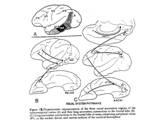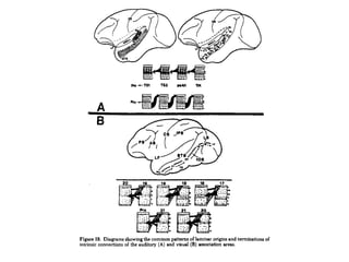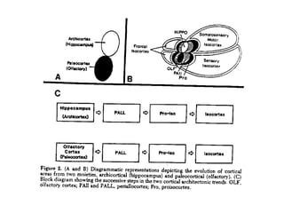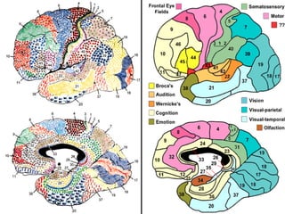 This document discusses the anatomy and functions of the frontal lobes. It begins by describing the basic anatomy of the frontal lobes, including different regions such as the medial frontal gyrus and inferior frontal gyrus. It then discusses how the frontal lobes are well-connected throughout the brain and mediate various functions through different frontal circuits and systems. The document goes on to discuss theories of frontal lobe function, including Luria's model of modular organization and Goldman-Rakic's work on working memory. It proposes the dual trends theory to describe the evolutionary origins and functional divisions within the frontal lobes.