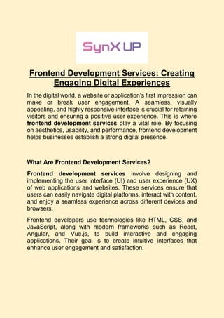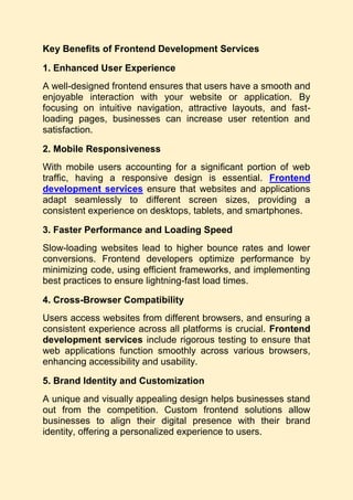 Frontend development services focus on crafting intuitive, visually appealing, and responsive user interfaces (UI) while optimizing the overall user experience (UX) across web applications and websites. These services ensure users can effortlessly navigate, interact with content, and enjoy a consistent experience on all devices and browsers.