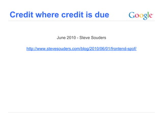 The document discusses the frontend single point of failure (SPOF) problem caused by blocking JavaScript and CSS files. It provides examples of popular websites, code libraries, widgets, and content management systems that contribute to frontend SPOFs. The document recommends solutions for browsers, widget owners, CMS developers, and site owners to address this issue through asynchronous loading of resources and better monitoring of frontend performance.