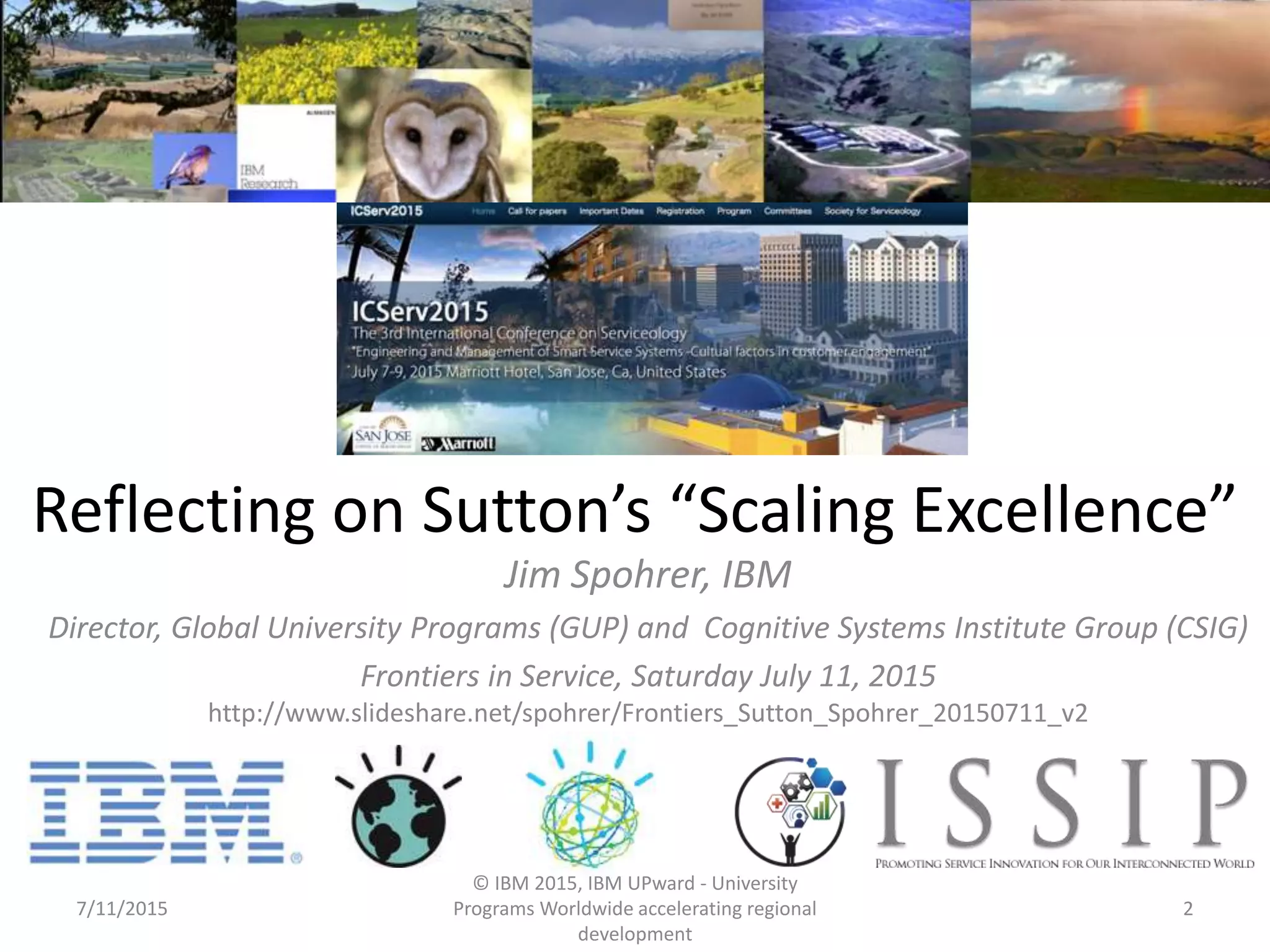 The document discusses scaling excellence in service systems. It notes that service systems involve stakeholders, technology, shared information, and organizations connected through value propositions. Scaling service systems requires investment in roadmaps for smarter buildings, universities, and cities. A service science perspective considers the evolving ecology of entities within service systems, how value is co-created, and how capabilities are elevated. Cognitive systems and cognitive assistants can help scale service innovation excellence and close the skills gap between knowing and doing.