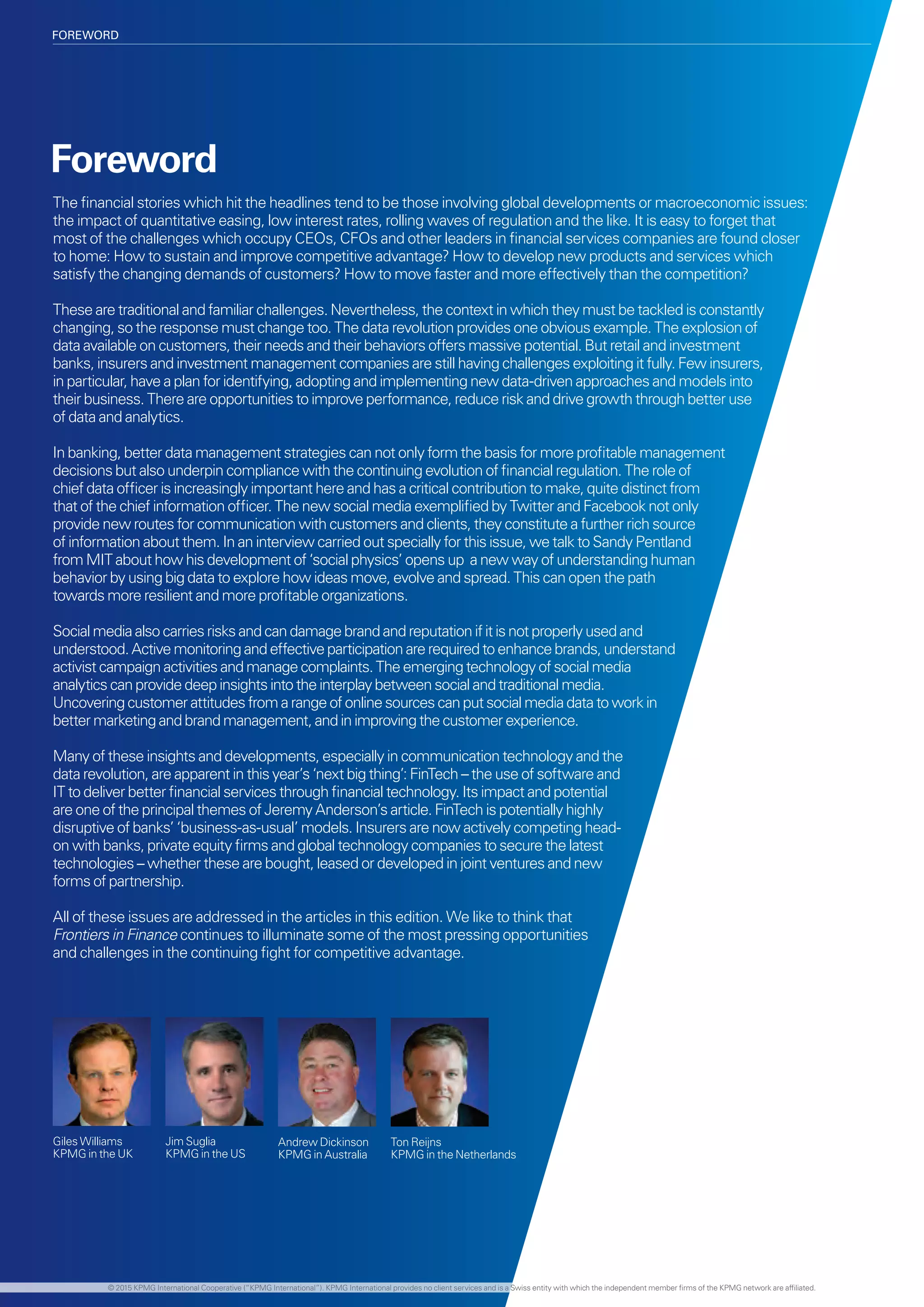 This document provides an overview of the June 2015 issue of Frontiers in Finance, a publication focused on decision-makers in the financial services industry. It includes the following key points: