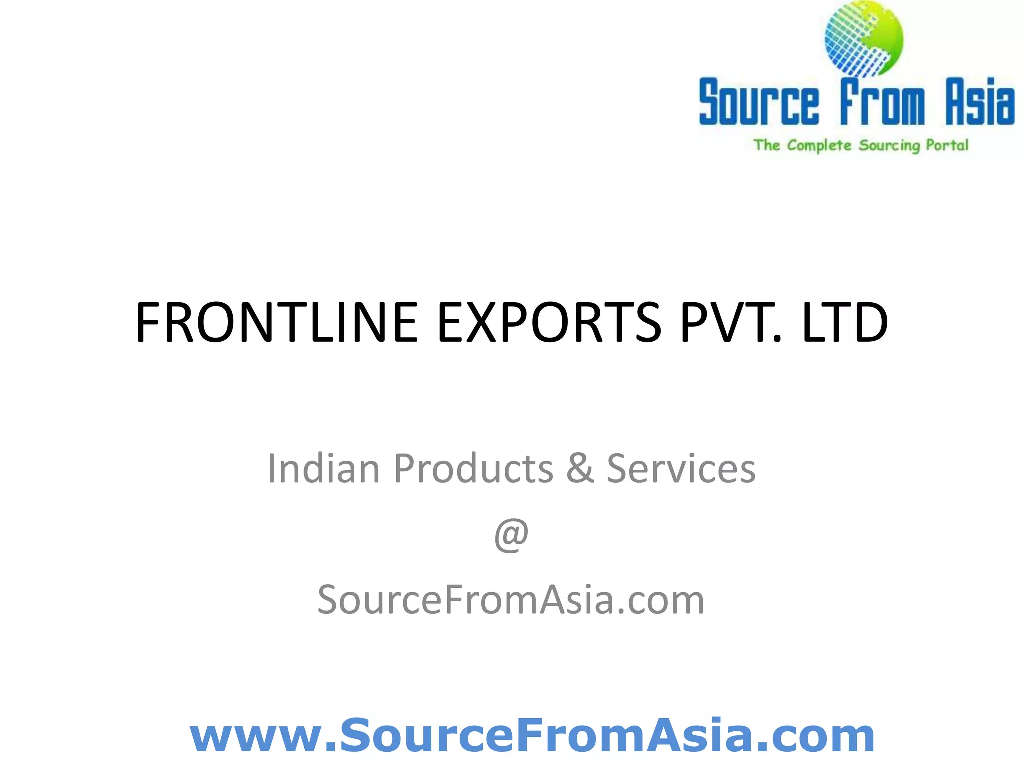 Frontline Exports Pvt. Ltd. offers Indian products and services through the platform Sourcefromasia.com, which serves as a comprehensive sourcing portal for Asian goods. The company is located in Aroor, Alappuzha, Kerala, and provides free sourcing and buying advisory for buyers through their email and Skype contact options. More information can be found on their website.