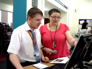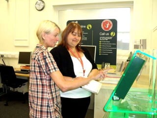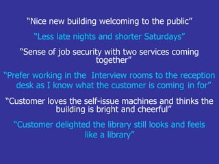The document discusses plans to improve customer service in Fife through a frontline merger that would establish a shared contact center for telephone inquiries, develop online resources for online enquiries, and share facilities like libraries, local offices, and community halls for face-to-face transactions. The goals are to increase customers' choice of access points, make more efficient use of council buildings, reduce costs, and integrate service delivery for both high-volume, low-complexity inquiries and lower-volume, high-complexity inquiries. The experience in Methil is provided as an example, where staff reported benefits like a welcoming new building, a sense of job security, and customers being pleased with features like self-issue machines while still feeling