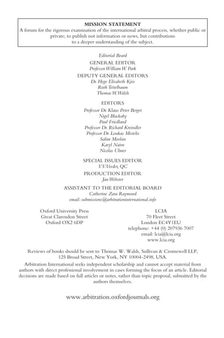 This document is the table of contents for Volume 31 Number 2 of the journal Arbitration International from June 2015. It lists several articles and contributions on topics related to international arbitration, commercial courts, bilateral investment treaties, emergency arbitrators, and enforcement of arbitral awards. A book on the Vienna Rules is also reviewed. The journal seeks to further understanding of international arbitration through independent scholarship.