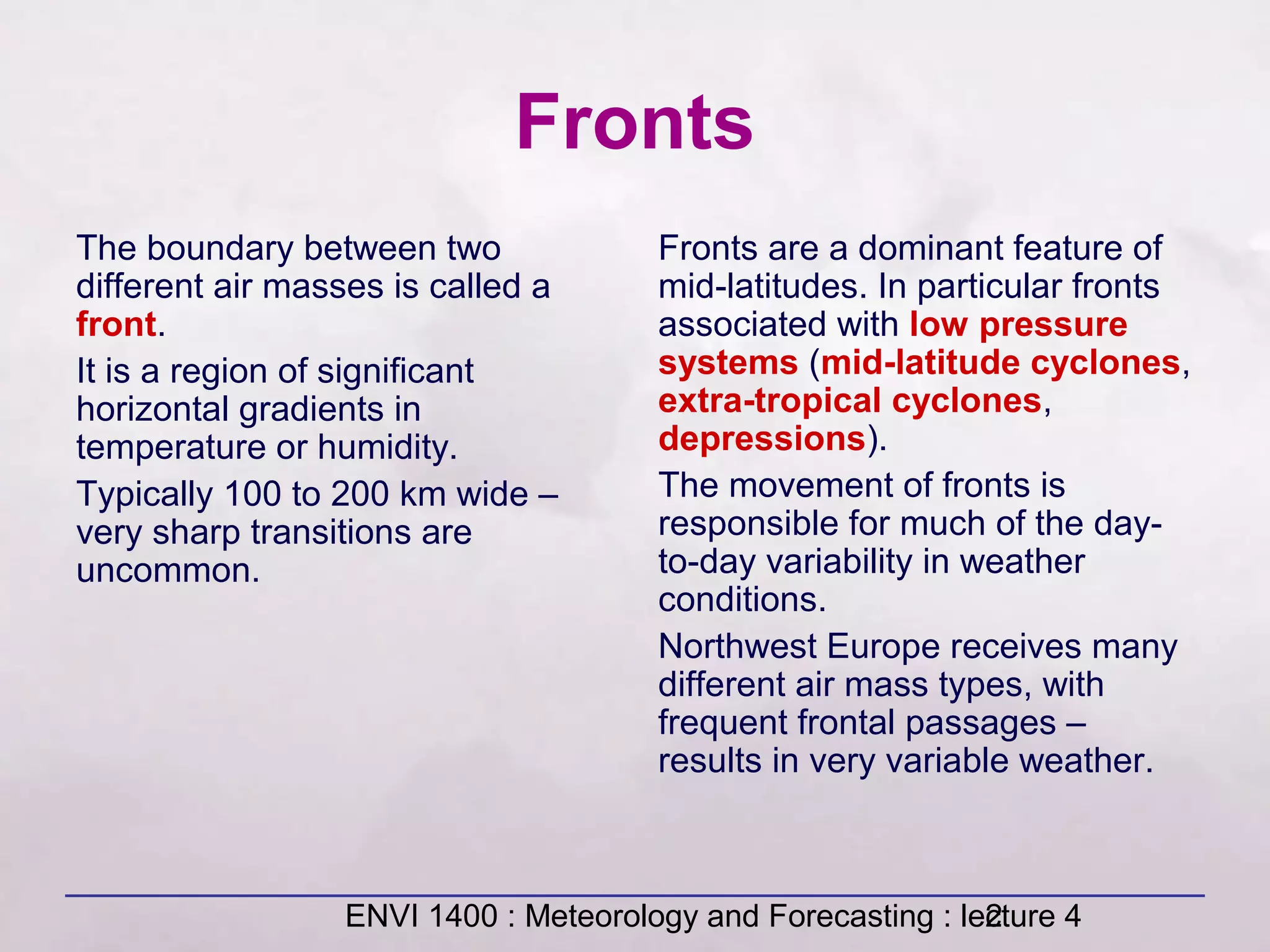 This document provides an overview of fronts and mid-latitude cyclones. It discusses the different types of fronts including warm fronts, cold fronts, stationary fronts and occluded fronts. It describes how mid-latitude cyclones form along polar fronts and the associated weather patterns. Key features of mid-latitude cyclones include the progression from warm to cold to occluded fronts as the cyclone evolves over time, bringing changing weather conditions to affected regions.