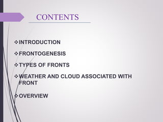 This document discusses different types of air fronts that form due to the interaction between converging air masses with different properties. It describes four main types of fronts: cold fronts, where cold air replaces warm air; warm fronts, where warm air overrides cold air; stationary fronts, where neither air mass advances; and occluded fronts, where cold air overtakes warm air. For each front, it outlines the associated weather patterns and cloud formations.