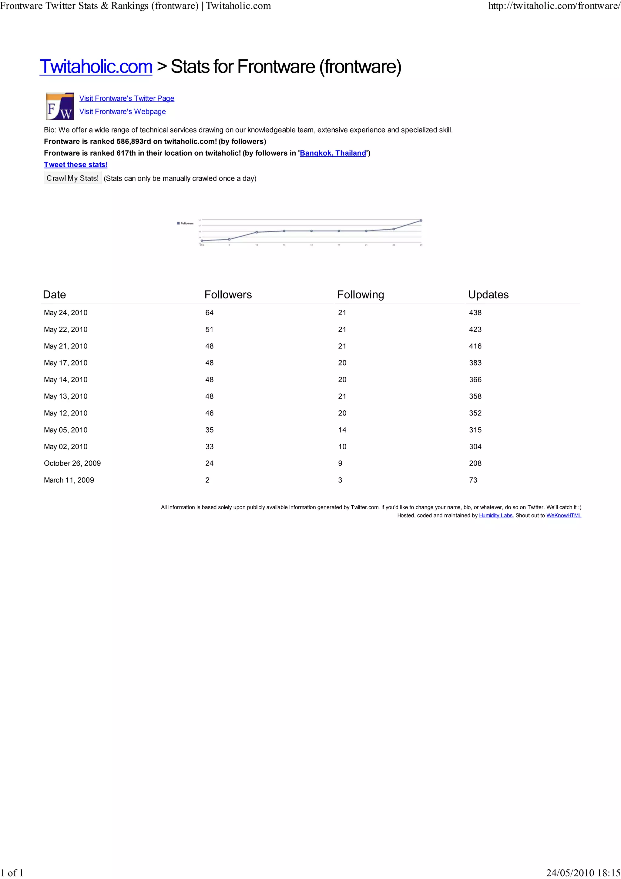 Frontware is a company located in Bangkok, Thailand that offers technical services. Their Twitter profile shows they have 64 followers and are ranked 586,893 globally and 617 in Bangkok based on their number of followers. The summary provides an overview of the company and key statistics from their Twitter profile as of May 24, 2010.