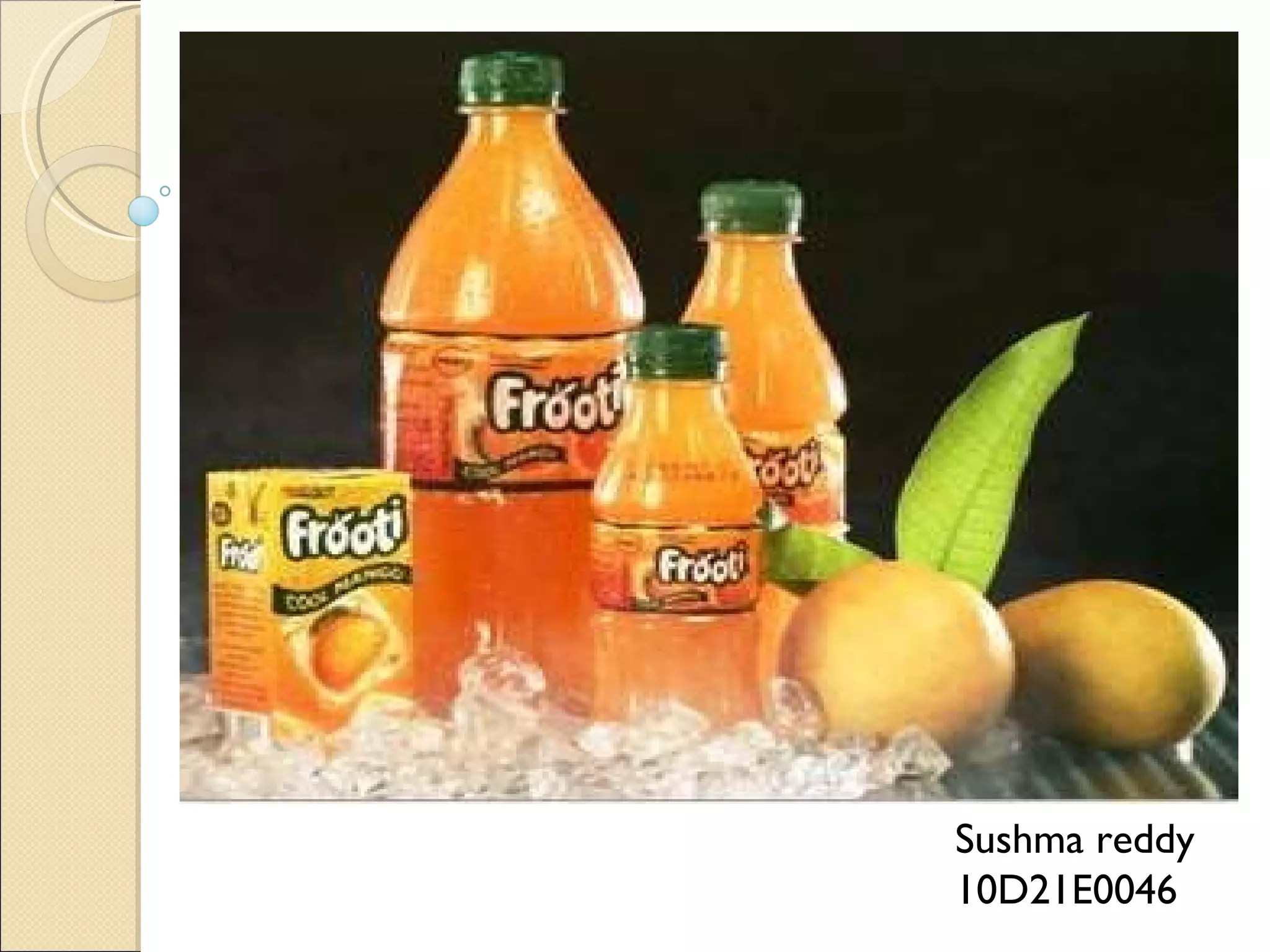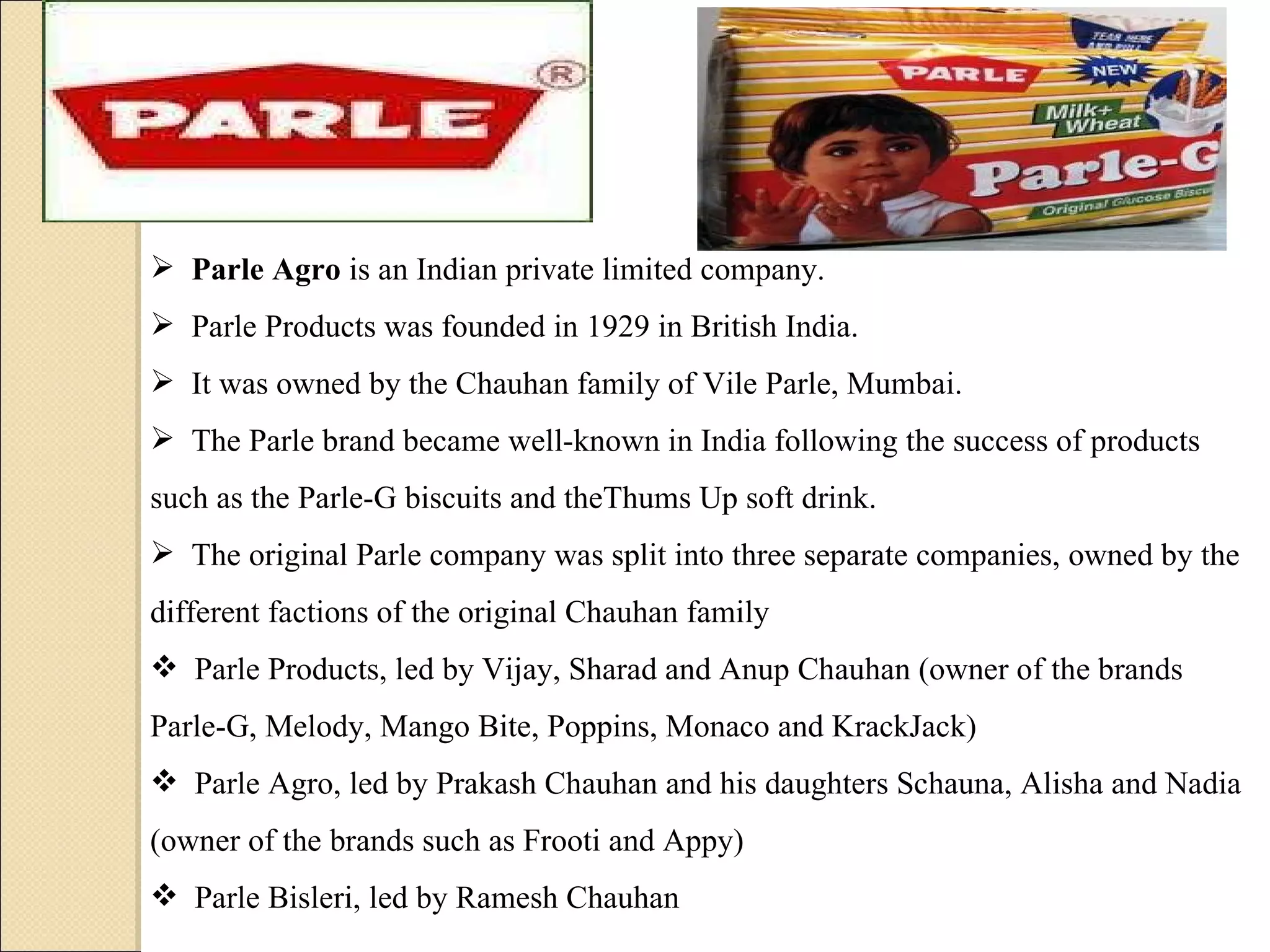 Parle Agro is an Indian company founded in 1984 that started with beverages and later expanded into other areas. It launched Frooti, India's first mango drink sold in Tetra Pak packaging, in 1985. Frooti became very popular and the largest selling mango drink in India. In the late 1990s, Frooti's sales stagnated due to increased competition. Parle Agro revamped Frooti's packaging and positioning in 2001 to target youth aged 16-21 and launched an advertising campaign called "Digen Verma" to boost excitement around the brand.