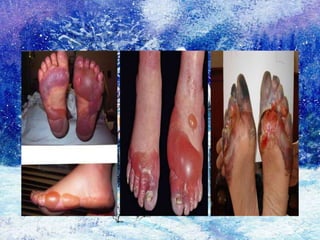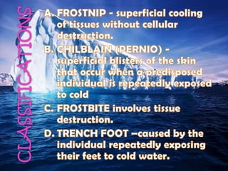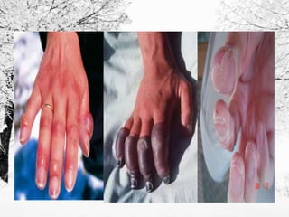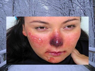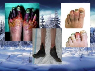 Frostbite refers to skin and tissue damage caused by freezing temperatures below -0.55°C. It is most common in people spending long periods outdoors, the very young/old, and those with circulation problems or taking medications that constrict blood vessels. When exposed to cold, the body prioritizes core warmth by constricting blood vessels in the extremities, causing them to freeze. Frostbite symptoms range from numbness to blistering and blackened skin depending on severity. Immediate first aid includes slowly rewarming the affected area and seeking medical help to assess damage and prevent complications like infection or tissue death.