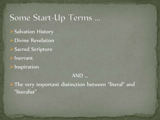3) Multiple literary and historical analysis methods are outlined to aid careful interpretation, such as form criticism, redaction criticism, and source criticism. The overall goal is to understand both the human authors' intentions as well as God's intended message.