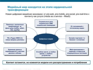 Документ анализирует трансформацию рынка интернет-телевидения и видео-услуг как в мире, так и в России, подчеркивая значительные изменения в моделях потребления контента. Упоминается о переходе к новым бизнес-моделям, основанным на контенте как услуге и о росте конкуренции среди операторов, способствующем эволюции видео-потребления. Основные выводы акцентируют внимание на том, что видео становится значимым элементом сетевой инфраструктуры и новой формой коммуникации.