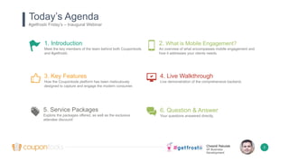 This document provides an overview and agenda for a webinar on the Coupontools mobile engagement platform. The webinar will include introductions of the leadership team behind Coupontools and #getfrostii, a discussion of what mobile engagement is and how the Coupontools platform addresses it, an overview of the platform's key features including delivery methods and analytics, a live demonstration of the backend system, a question and answer session, and a review of the service package options. Case studies will also be presented showing how the platform has driven engagement and revenue for clients in industries like consumer packaged goods and professional sports.