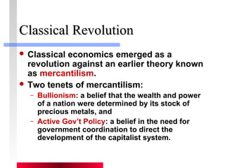 This document provides an overview of classical macroeconomic theory. It discusses how classical economics emerged as a revolution against mercantilism, emphasizing free markets and real factors of production over money and trade balances. Key aspects of classical theory covered include: