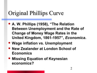 This document summarizes key concepts relating to output, inflation, and unemployment from chapters in an intermediate macroeconomics textbook. It discusses the original Phillips curve developed by A.W. Phillips showing the relationship between wage inflation and unemployment. It then covers Milton Friedman's natural rate theory which argues that in the long run, real variables like employment are determined by real factors, not monetary factors. The document also discusses how expectations of future inflation can shift the short-run Phillips curve and the policy implications of these concepts.