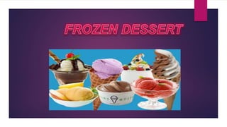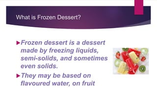 Frozen dessert is a dessert made by freezing liquids, semi-solids, or solids, and can be based on flavored water, fruit, or dairy. It is classified as either still frozen or churn frozen depending on whether it is churned during freezing. Common types include ice cream, frozen yogurt, sorbet, gelato, sherbet, and frozen custard. Ingredients typically include sugar, cream, milk, and flavorings. Problems that can occur include lumps, granular texture, and poor flavor. Popular Indian and international brands that serve frozen desserts are listed.