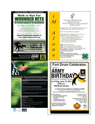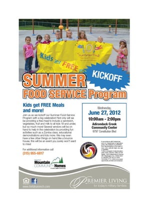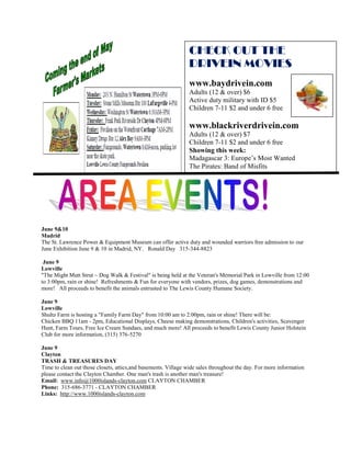 Military families will have access to over 1,600 museums for free through the Blue Star Museums program. The document also lists various community events in towns in northern New York, including drive-in movies, museum exhibits, festivals, concerts and more happening between June and August 2012. Readers are encouraged to research each event for full details.