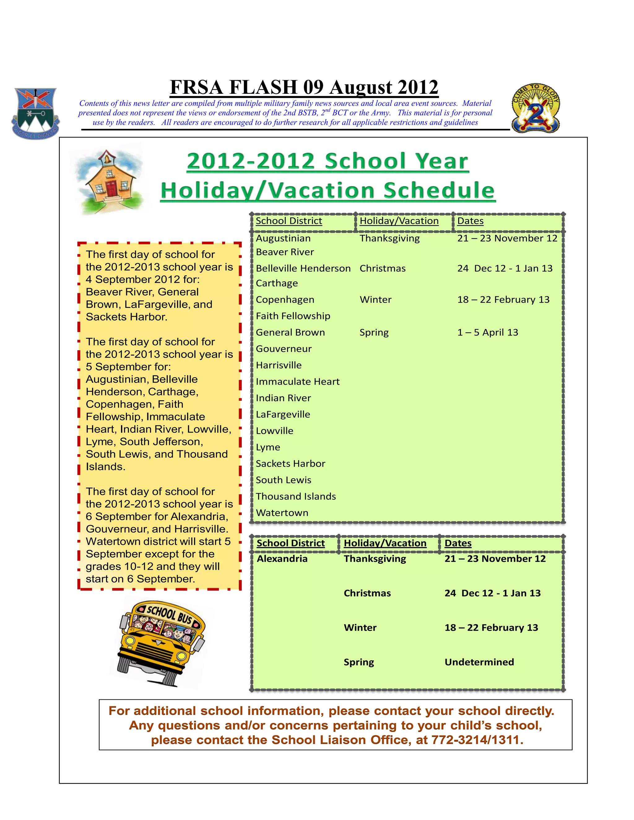 This newsletter provides information about upcoming local events and school calendars for the 2012-2013 school year. It includes the first day of school dates for various school districts in the area, as well as details about summer concert series, festivals, and movies playing at local drive-in theaters. Readers are encouraged to verify dates and restrictions for any events.
