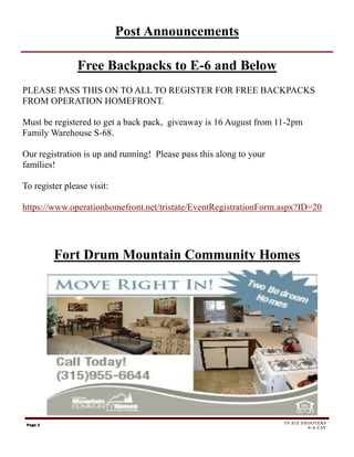 The document provides information about upcoming Family Readiness Group meetings, training events, and activities happening around Fort Drum in August. Key details include dates and locations for pre-deployment briefings, FRG leader training, a family day event at Remington Park, and upcoming concerts, farmers markets, and recreational activities in the local area. The newsletter also includes announcements, important contact information, and recurring program offerings at Fort Drum.