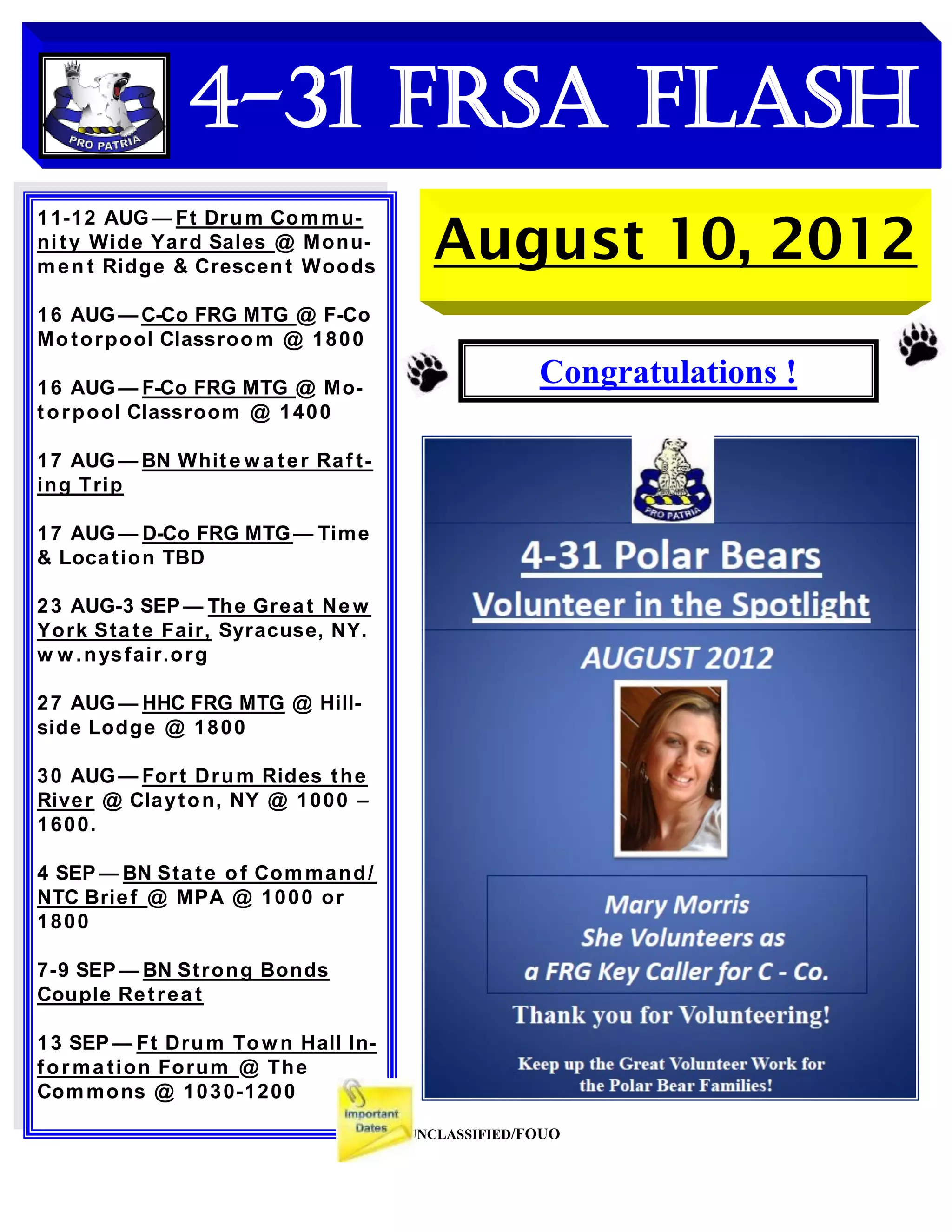 This document provides a list of upcoming community events and training opportunities at Fort Drum for the month of August 2012. Key events include yard sales on August 11th, FRG meetings on August 16th and 17th for different companies, a white water rafting trip on August 17th, and the Great New York State Fair from August 23rd to September 3rd in Syracuse. It also lists contact information for resources like the Military and Family Life Consultant and upcoming FRG training classes.