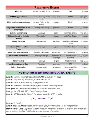 This document provides a summary of recurring events, upcoming events, trainings, volunteer opportunities, and things to do around Fort Drum and the surrounding North Country region from June 16-30, 2012. It lists over 30 recurring community support groups, classes, and activities. It also outlines over 15 specific local events, trainings, and fairs happening within the next two weeks. The document encourages exploring attractions in the region like parks, zoos, farms, wineries, and hydroplane races during the summer months. It provides contact information for community resources and the point of contact for the newsletter.