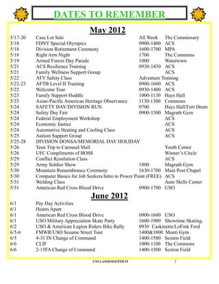 This document lists various dates, events, and meetings for the 4-31 Infantry Battalion in May and June. It includes dates for Family Readiness Group meetings, military ceremonies and parades, family activities, training opportunities, and blood drives. Contact information is provided for resources like the Military and Family Life Consultant and for the 4-31 Facebook page and newsletter.