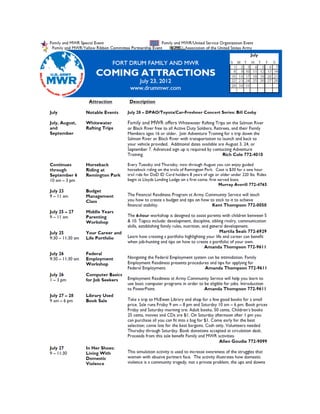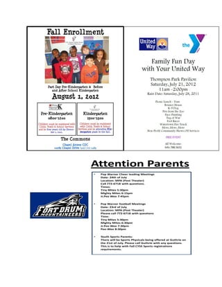 This document is a newsletter compiling information from various military and local sources for personal use by readers. It provides notices about upcoming events like concerts, fairs, and festivals in the region as well as closures of the Fort Drum Veterinary Clinic on certain Fridays. Readers are encouraged to research any applicable restrictions or guidelines themselves.