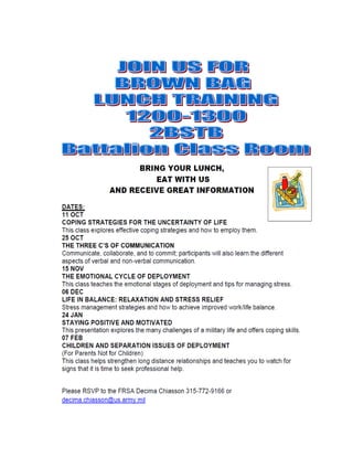 This document provides a summary of events, training opportunities, and other information for military families. It lists various suicide prevention resources available year-round. It also announces upcoming family readiness group training, stress and anger management classes, financial readiness training, and coping with deployments classes happening in late September and October. Readers are encouraged to contact the organizations for more details and to RSVP for events.