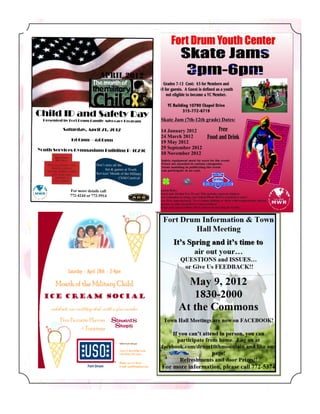 This document provides a summary of events and programs occurring at Fort Drum in April 2012 related to military families. It includes information about classes offered through the Army Family Advocacy Program, the Exceptional Family Member Program special Olympics, the Relocation Readiness Program, and the Financial Readiness Program. It also lists the schedule of theater showings at the post, volunteer opportunities, and the locations and times of various training.
