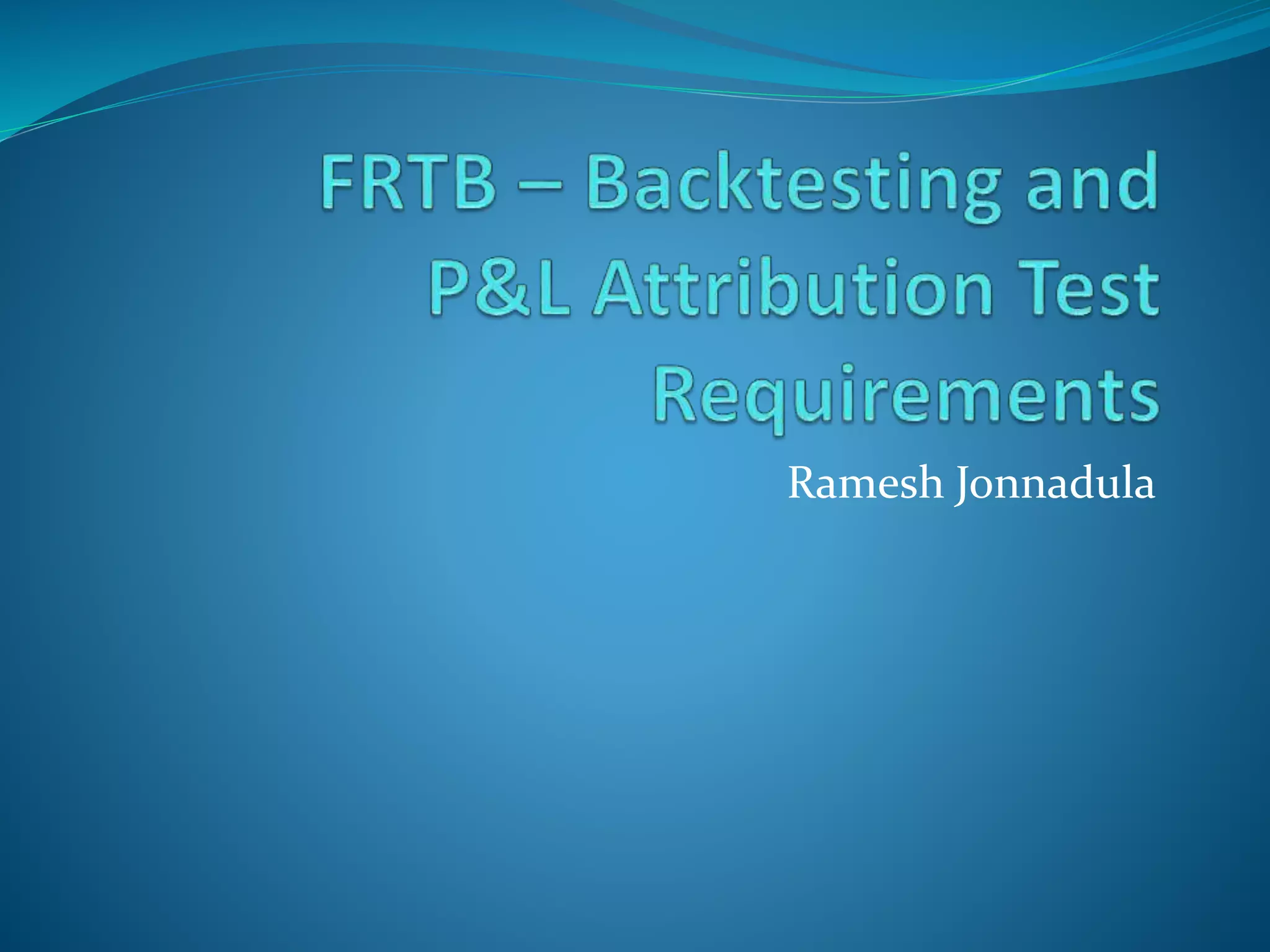 1) Banks must pass backtesting at the bank-wide level and desk-level to use internal models to determine market risk capital requirements. Backtesting compares Value at Risk (VaR) to actual and hypothetical profit and loss.