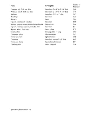 This document provides a table listing common vegetables and their fructose content per serving. It shows the serving size and grams of fructose for over 40 different vegetables. Fructose levels vary significantly between vegetables, from 0 grams in some mushrooms to over 13 grams in a medium head of cabbage. Most vegetables contain less than 3 grams of fructose per listed serving size.