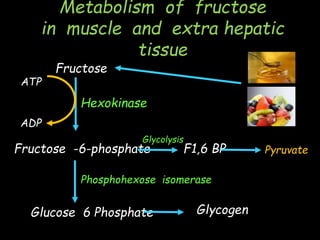This document discusses fructose metabolism in the liver and extrahepatic tissues. It notes that fructose is metabolized to fructose-1-phosphate in the liver by fructokinase and can then enter pathways like glycolysis, glycogen synthesis, or lipogenesis. In extrahepatic tissues, fructose is first phosphorylated to fructose-6-phosphate by hexokinase and can then be converted to glucose-6-phosphate and enter glycolysis. Excessive fructose consumption can lead to hypoglycemia, hyperuricemia, and increased fatty acid and cholesterol levels due to increased flux through these metabolic pathways. Rare genetic defects like hereditary fructose int