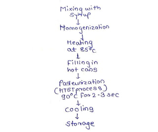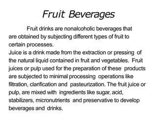 Fruit beverages are made from fruit juices or pulp that undergo minimal processing like filtration and pasteurization before being mixed with ingredients like sugar, acid, and preservatives. Ready-to-serve beverages as specified by FSSA must contain at least 10% fruit content and 10% total soluble solids while having a maximum acidity of 0.3% citric acid. They also allow preservatives up to 70ppm sulfur dioxide and 120ppm benzoic acid since no dilution is needed before drinking. The document outlines specifications for fruit beverages and provides process flow sheets for making mango, orange, and jamun ready-to-serve beverages.