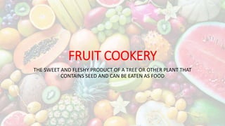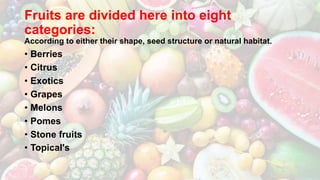 This document provides an overview of different types of fruits categorized into 8 groups: berries, citrus, exotics, grapes, melons, pomes, stone fruits, and tropicals. Each category lists examples and key details about the fruits. Berries are small fruits that grow on vines and bushes and must be fully ripened before harvesting. Citrus fruits are acidic and grow on trees in tropical climates. Exotic fruits have become more available due to transportation. Grapes grow in large clusters on vines and are classified by color. Melons are members of the gourd family and include sweet and water melons. Pomes have thin skin and seeds surrounded by firm flesh. Stone fruits have thin skin, soft flesh